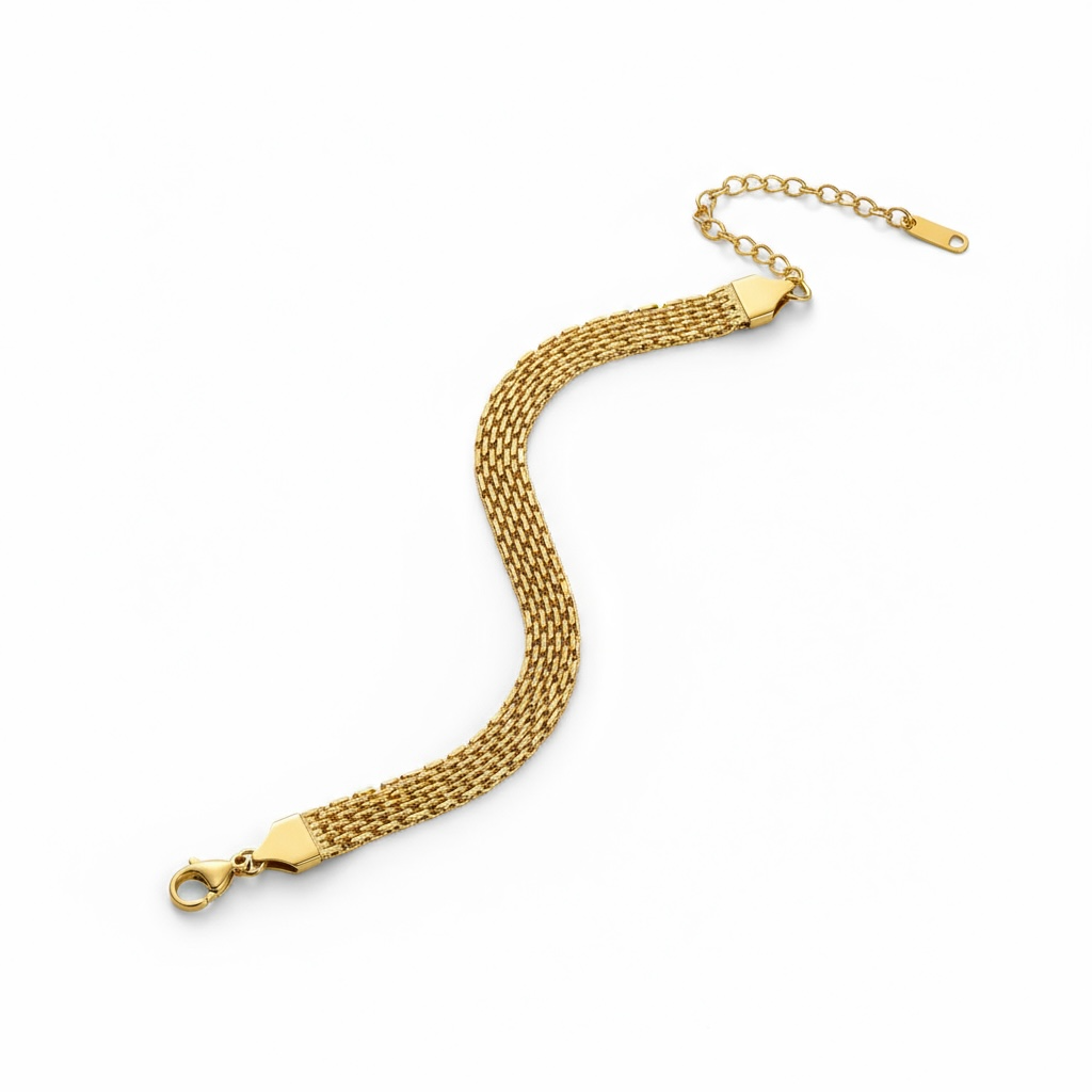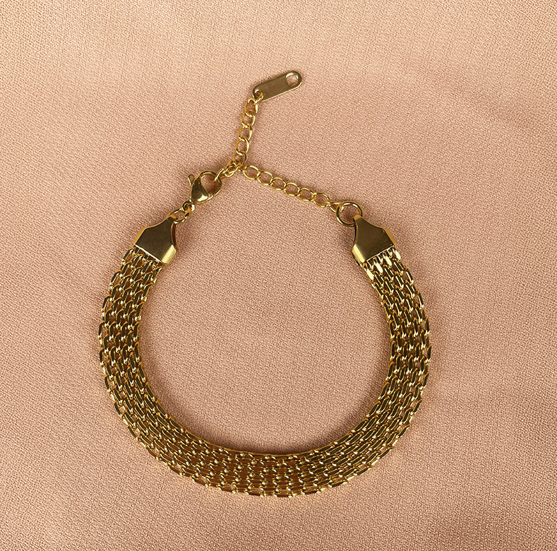 A thick, woven link chain with smooth drape and a glossy gold finish. The flexible chain hugs the wrist for a modern, polished look.