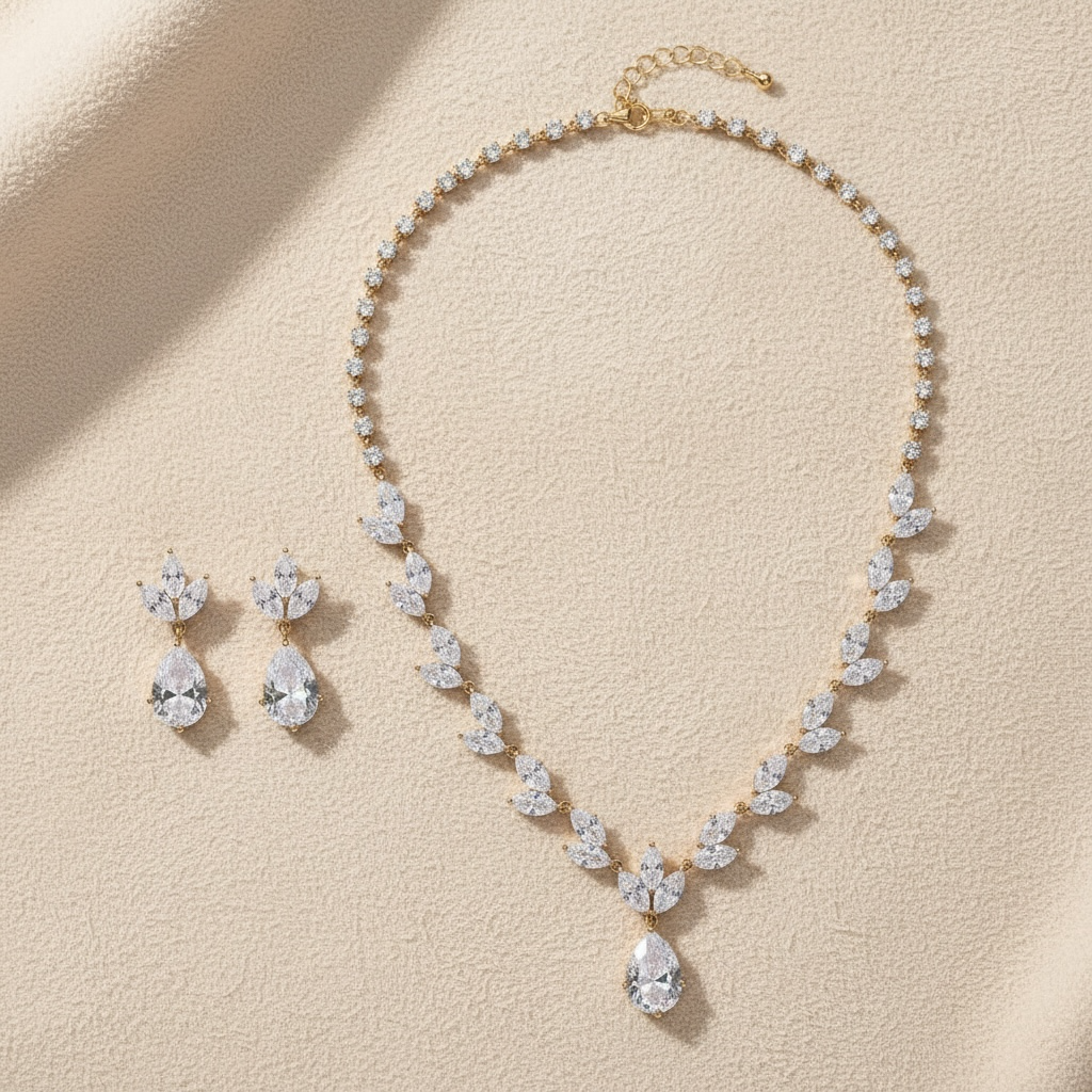 Gold tone necklace dotted with marquise leaf crystals and a refined center cluster. A clear teardrop pendant with matching drops adds soft sparkle for an elegant, polished look.