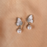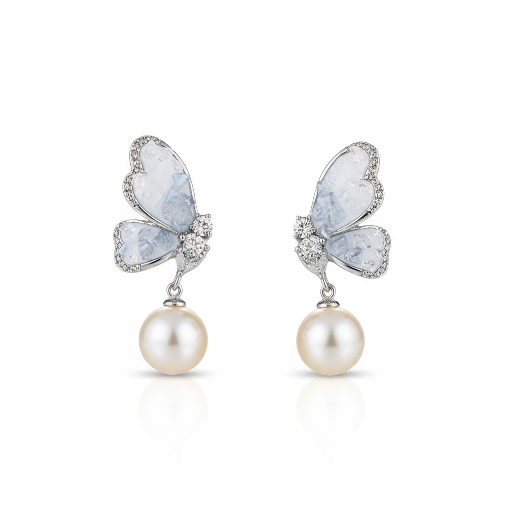 Delicate butterfly-wing earrings edged with subtle sparkle and an icy, textured finish. A luminous pearl drop adds soft movement for an elegant, feminine look.