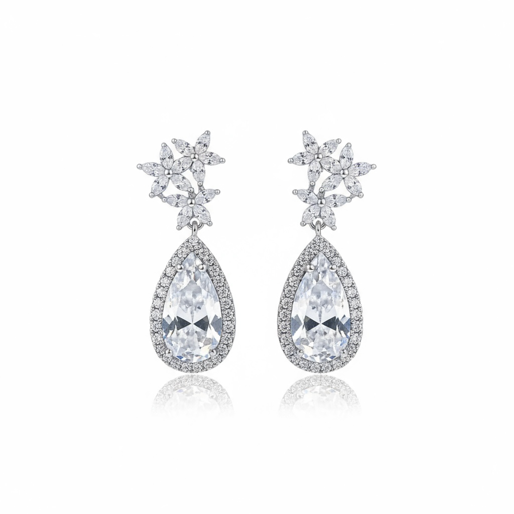Delicate marquise clusters bloom at the ear with bright, clear sparkle. A large pear-cut drop framed in a double pavé halo adds radiant shine.