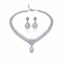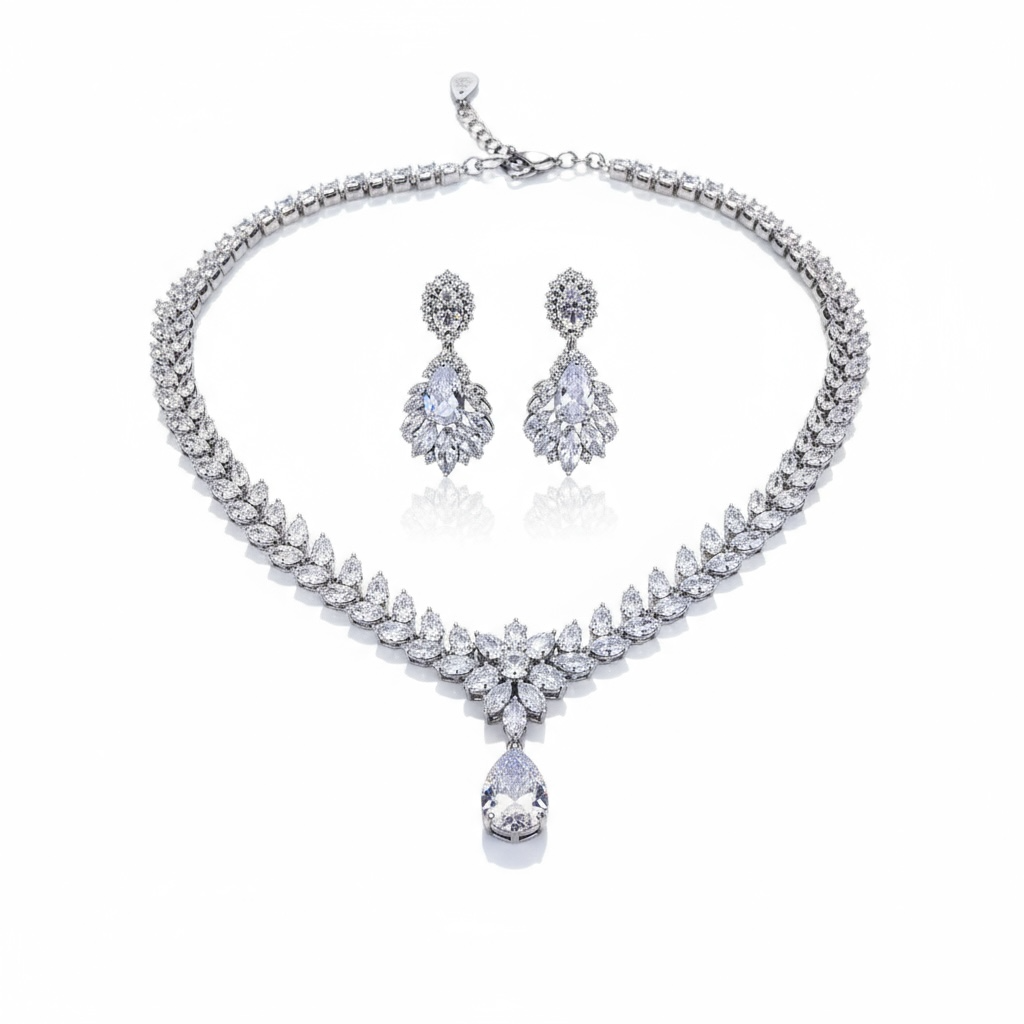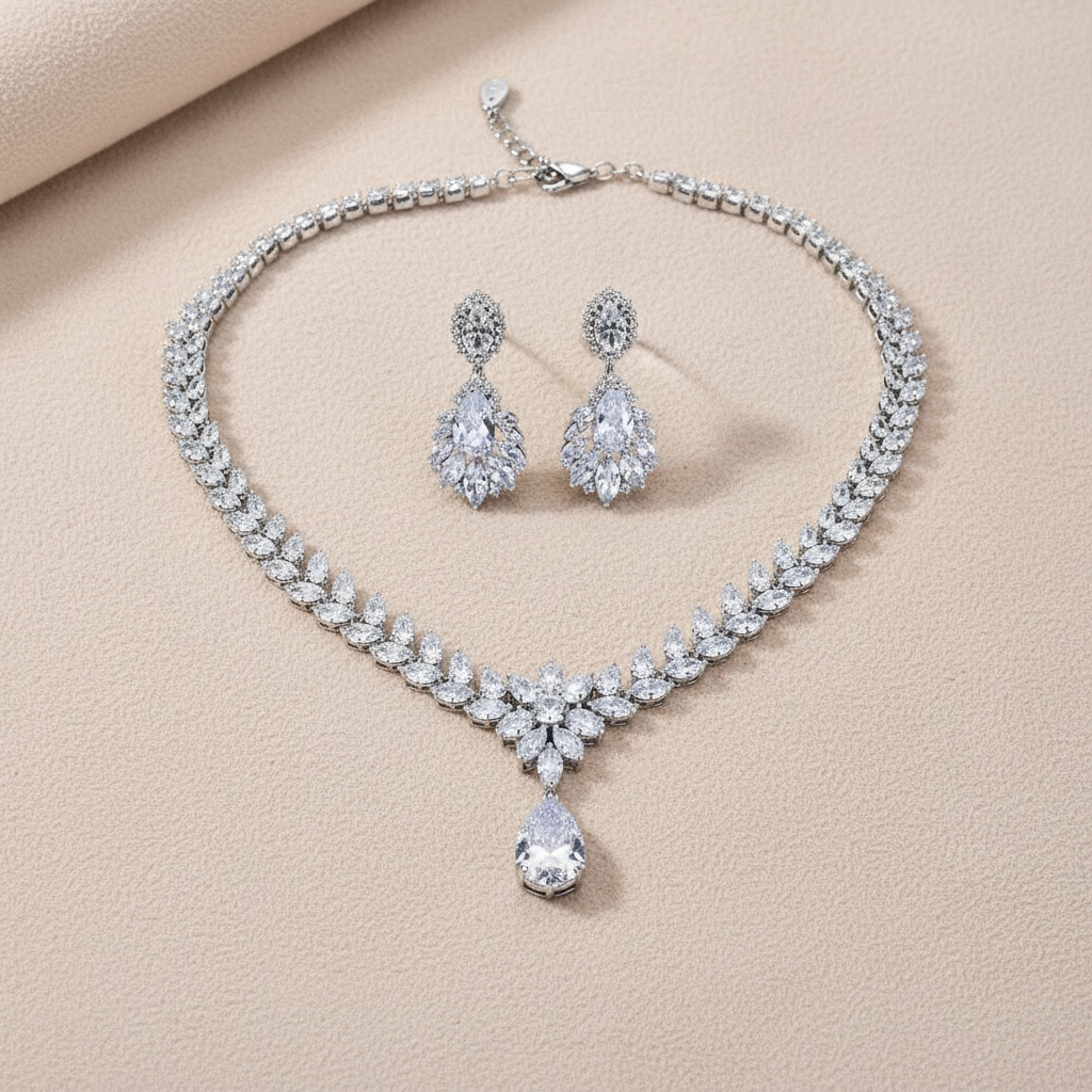 A V-shaped necklace lined with marquise crystals and finished with a pear drop that catches the light. Matching earrings echo the leaf motif for a luminous, luxurious set.