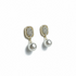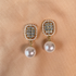 Cushion pavé earrings with a neat grid of crystals and a beaded border in warm gold. A smooth round pearl drop adds soft movement and elegant shine.